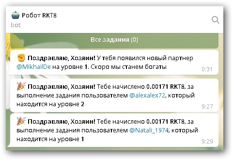 #rkt8 хочу отметить, что стало поступать вдвое большее количество заданий в день на выполнение, начислений от рефов больше. Опять же, больше заданий, больше и доход по итогам дня, часто стали появляться задания с оплатой в 30 центов, выполнил простые действия (подписка, лайк, комментарий), получаешь 0,3$, что примерно 20 рублей, заданий не менее 5-10 в день можно выполнить, вот Вам и дополнительный доход. RKT8 бот: https://t.me/RKT8robot?start=169207638